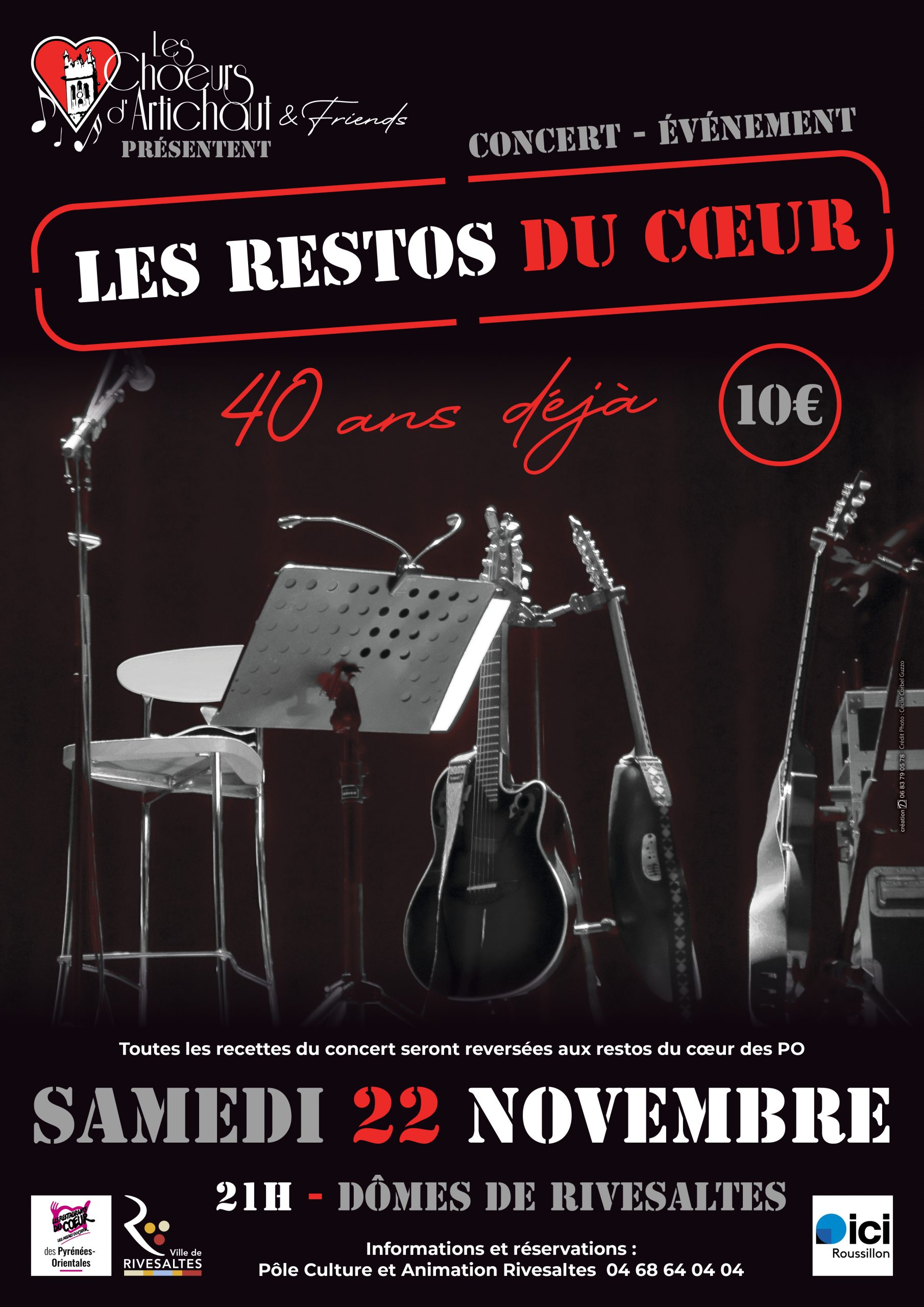 40 ANS DE RESTO DU COEUR Vous êtes ici : Accueil > Agenda > Événement Informations au 04 68 64 04 04 + Ajouter à mon Agenda Google Date 22 novembre 2025 Expiré Heure 21:00 Coût 10 euros Lieu Les Dômes Avenue de la Marne, Rivesaltes Catégories Culture Partagez cet événement Rechercher : Articles récents COMMÉMORATION COMMÉMORATION ENZO, RÉALISE UN RÊVE FANTASTIQUE ! VERGERS D’ABRICOTIERS SOUS PANNEAUX SOLAIRES LES ABRICOTS BIO DE RIVESALTES Commentaires récents